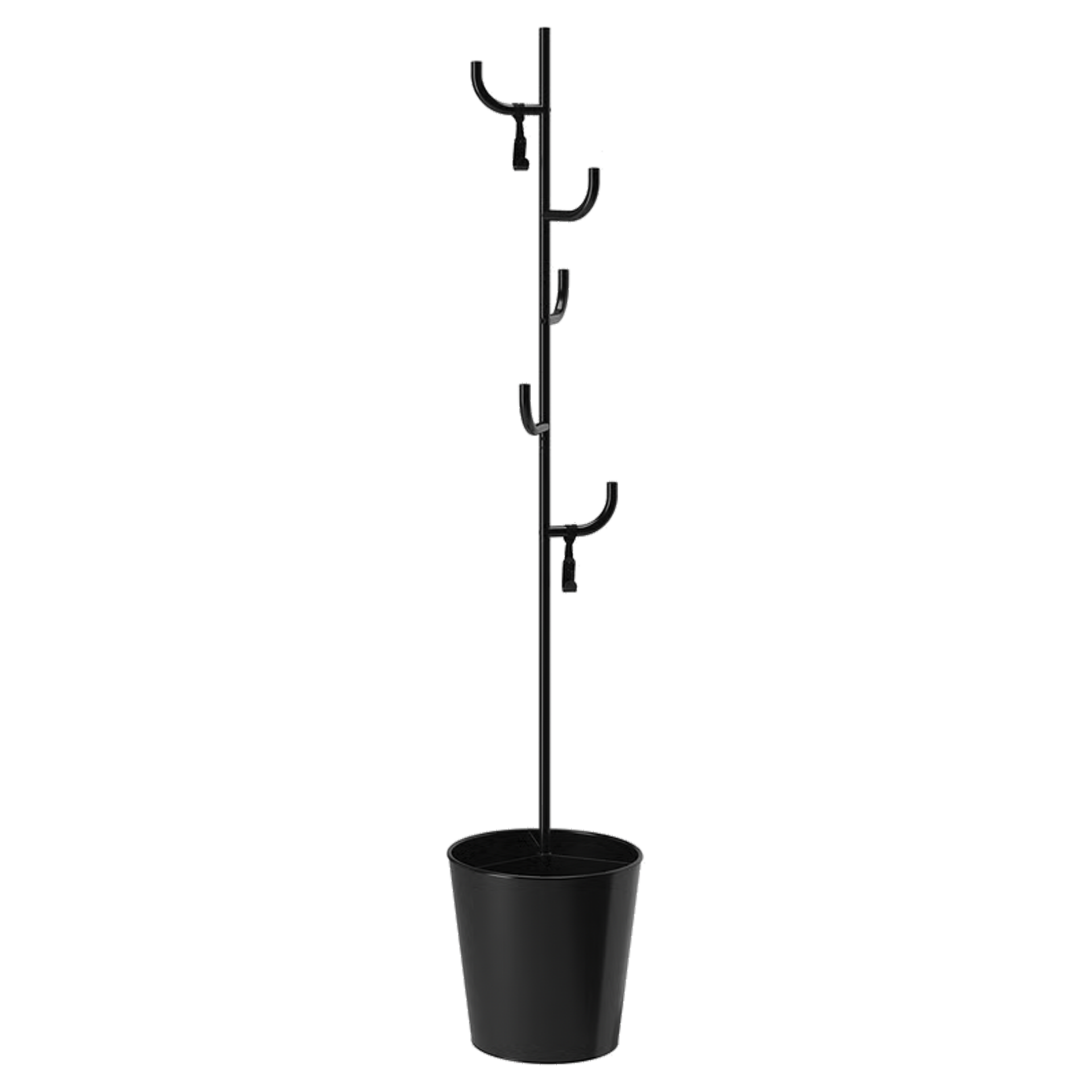 Porte-manteau sur pied au design minimaliste en métal noir, équipé de plusieurs crochets à différentes hauteurs pour vêtements et accessoires. Sa base en forme de pot permet également d’accueillir des parapluies tout en assurant une bonne stabilité.